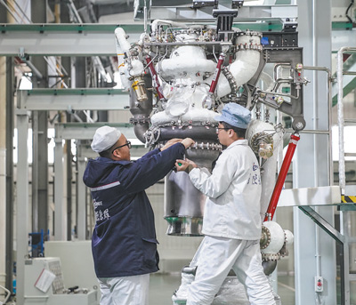 在北京星际荣耀空间科技股份有限公司,装配测试人员在装配液体火箭发动机。该公司加强自主研发,在商业航天运载火箭领域不断取得新突破。 |