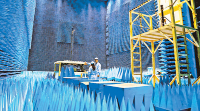 在中国科学院微小卫星创新研究院的微波暗室,科研人员进行卫星单机测试。 |