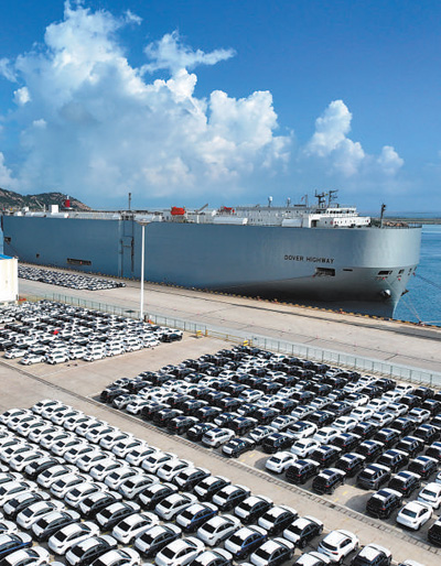 在江苏省连云港港东方港务分公司码头,滚装轮正在装载出口的国产汽车。 |