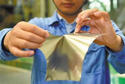 在位于山西的太钢集团,员工展示用手撕开0.02毫米厚的超薄带状不锈钢。 |