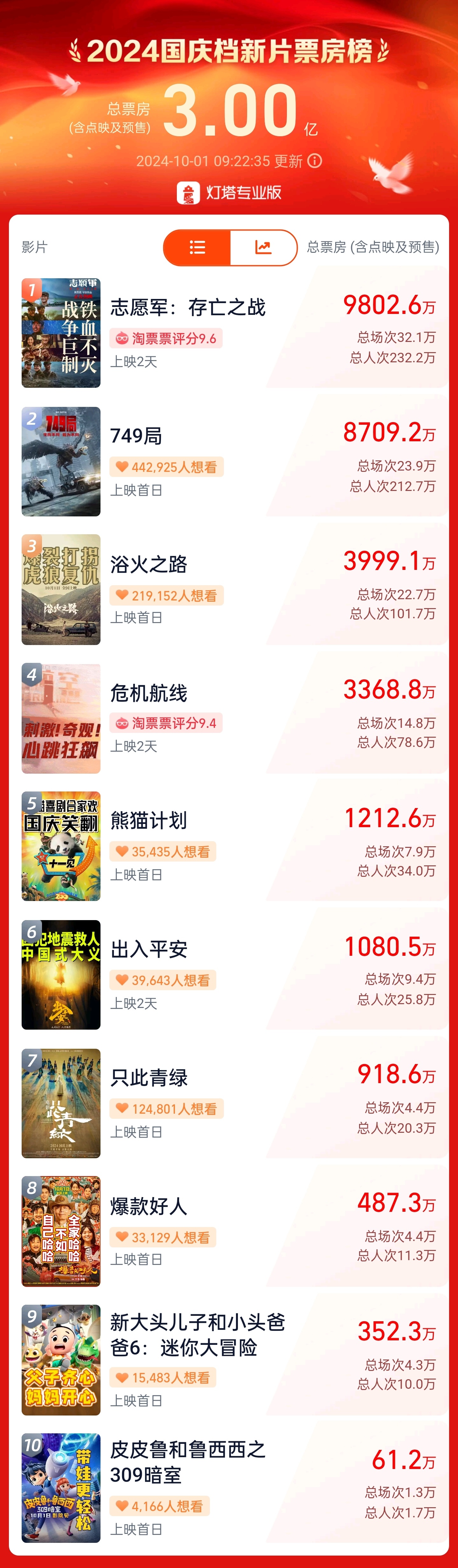 据网络平台数据,截至10月1日9时2分,2024年国庆档新片票房(含点映及预售)突破3亿!