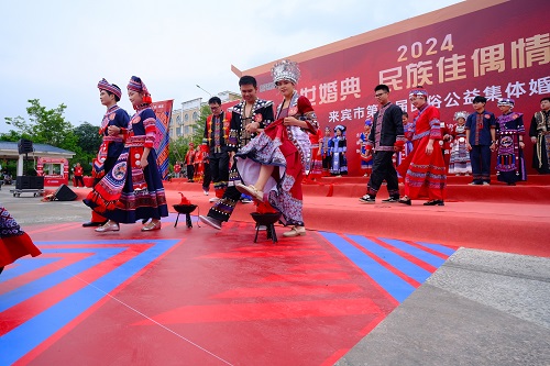 10月1日,以“盛世婚典,民族佳偶情定国庆”为主题的广西来宾市首届民俗公益集体婚礼在兴宾区城南新区廉政文化公园甜蜜举行,28对新人携手发出婚事新办、婚事简办的倡议。