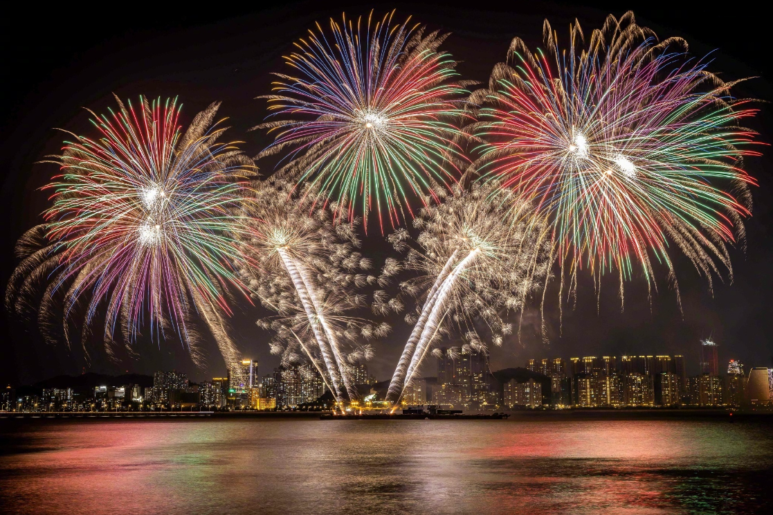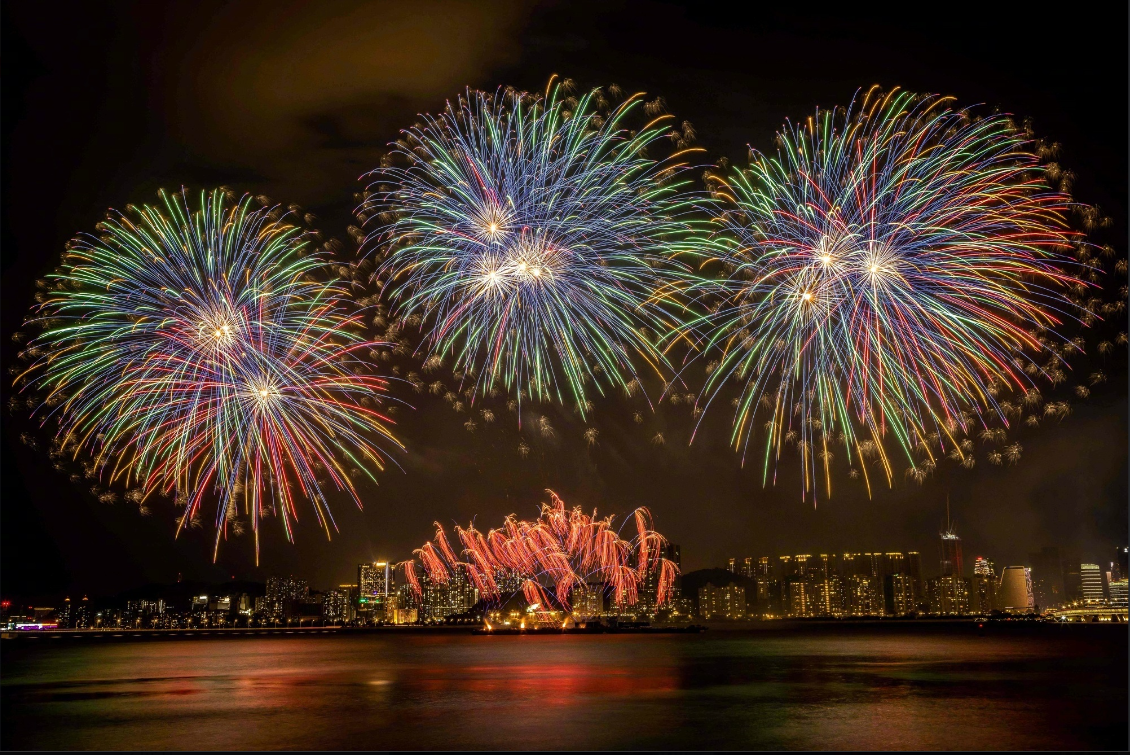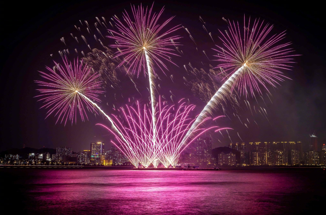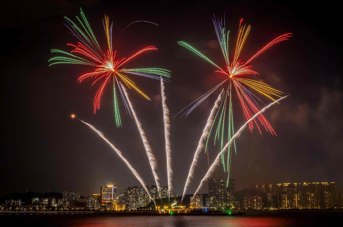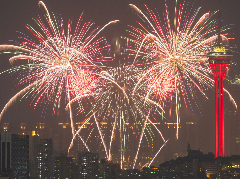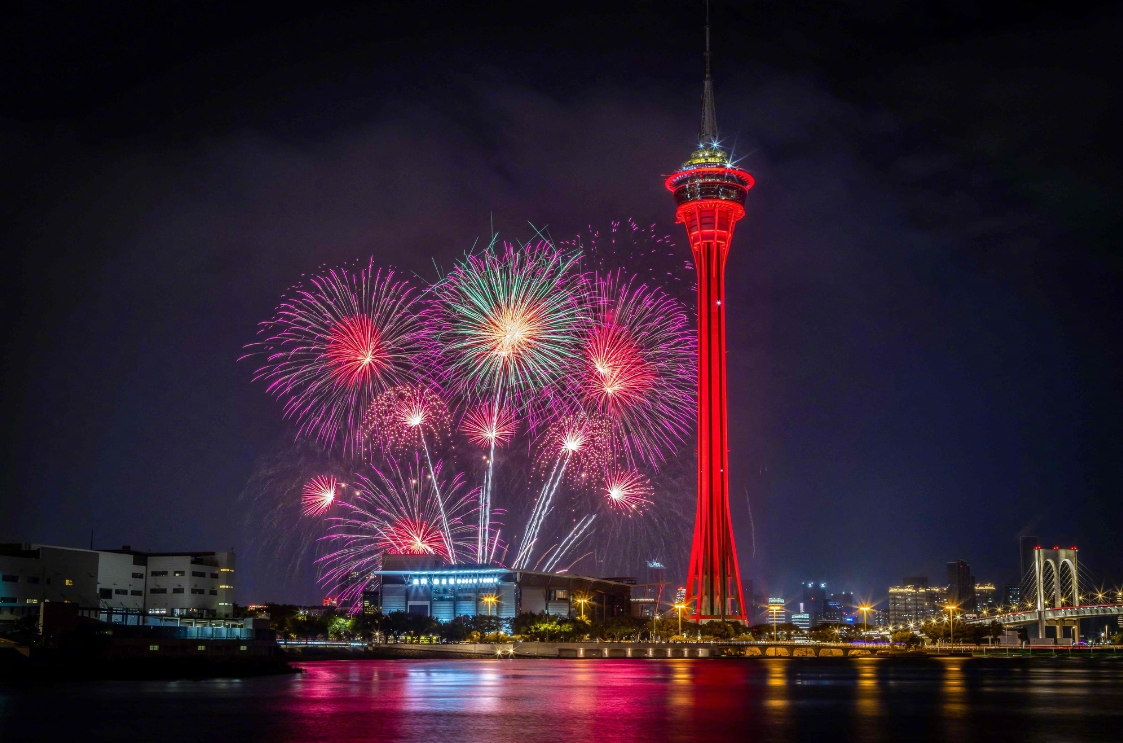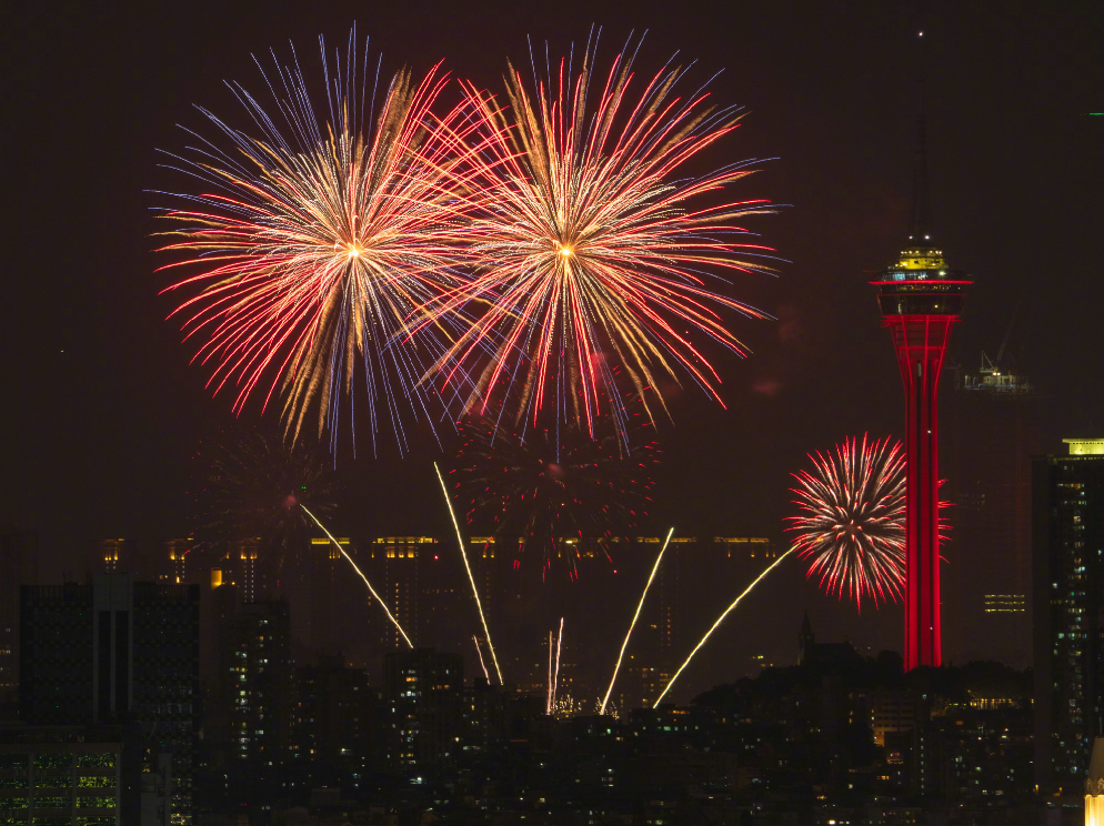 10月1日晚上,澳门旅游塔附近海面上演烟花比赛汇演。烟花秀在《七子之歌》《歌唱祖国》等歌曲下拉开序幕,庆祝中华人民共和国成立75周年。