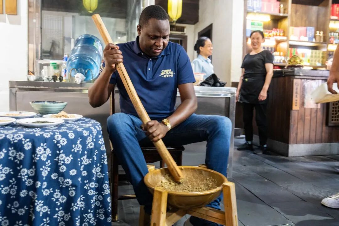 在湖南省常德市常德河街,外国游客体验非遗美食擂茶的制作。 新华社记者 陈思汗摄