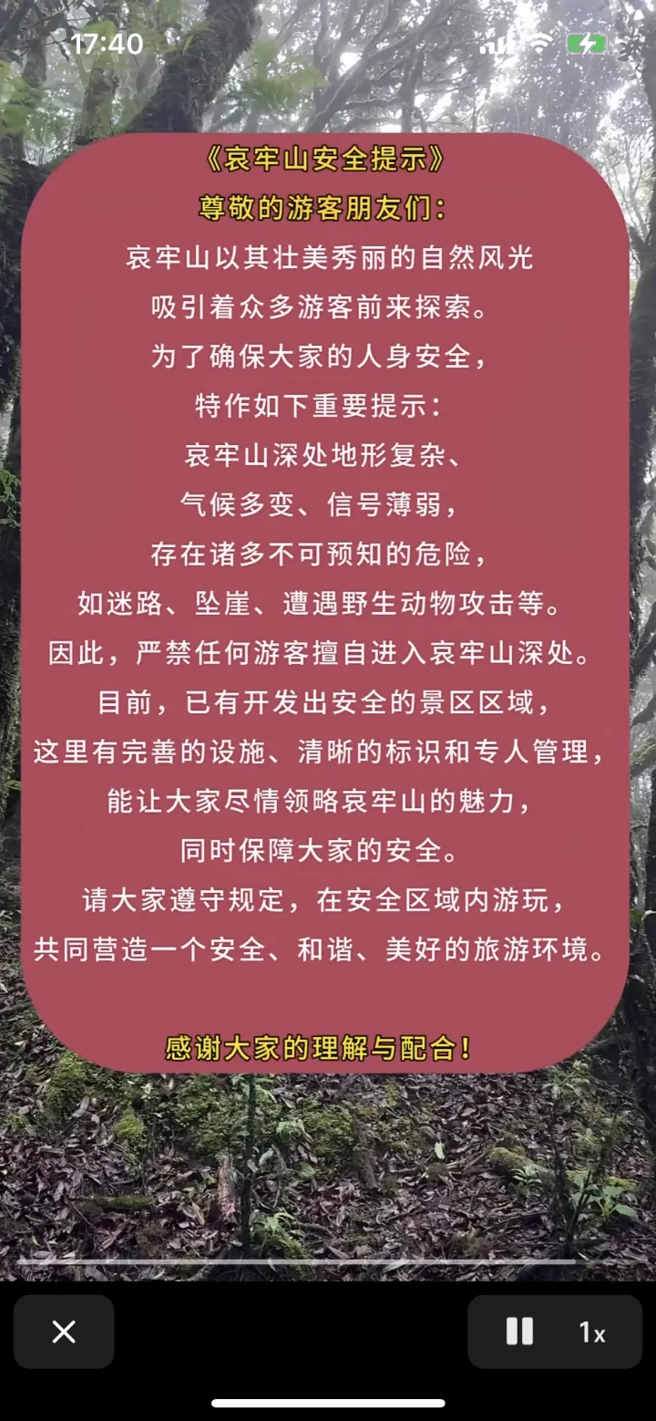 10月5日,@云南哀牢山仙境发布安全提示:哀牢山深处危险,别贸然前往未知地带,未开发区域不要深入。
