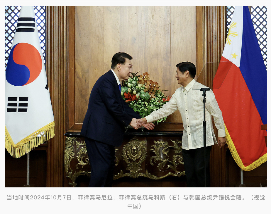 “尹锡悦访问菲律宾,韩国释放对抗中国的雄心。”香港《南华早报》7日称,这是2011年以来韩国总统首次对菲律宾进行国事访问。观察人士指出,尹锡悦对菲律宾进行“罕见”的国事访问,凸显首尔希望作为中等强国发挥更积极作用并制衡中国地区扩张主义的雄心。法新社在报道该消息时也提到,韩国此前就曾多次对南海紧张局势发表评论。