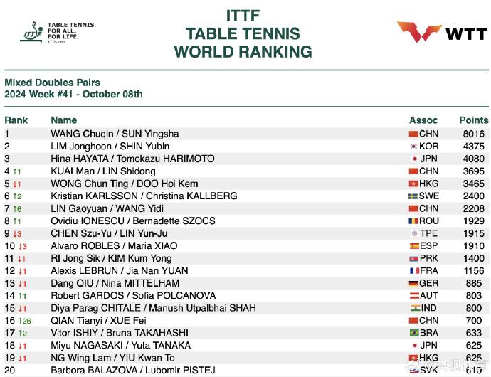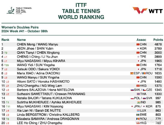 国际乒联最新排名正式公布,孙颖莎积分破万