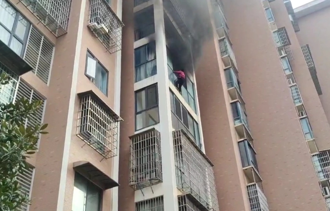 9时15分,消防救援力量到达现场。到场后,指挥员立即组织人员对火情进行侦查,经侦查发现火势当前处于猛烈燃烧阶段,起火位置有一名被困女子已爬至阳台窗户外面躲避浓烟,存在极大的坠落风险。