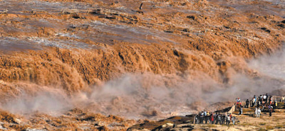 9月12日,受益于上游水库联合排沙的生态环保举措,黄河干流水量大涨,位于山西吉县和陕西宜川县交界处的壶口瀑布出现“金瀑飞流”景观。吕桂明摄(新华社发)