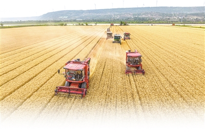 山西芮城县着力打造高效节水现代化灌区,合理引黄灌溉,推动农业绿色发展。图为风陵渡镇黄河滩涂上,联合收割机正在抢收小麦。薛 俊摄(影像中国)