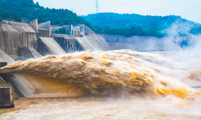 黄河流域防洪减灾体系不断完善,截至2023年汛前,小浪底水利枢纽参与27次调水调沙,下游主河槽高度平均下降3.1米。图为小浪底水库泄洪。苗秋闹摄(影像中国)
