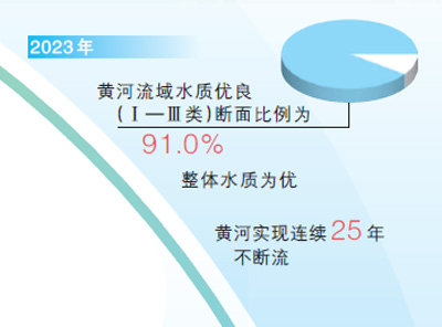 逐“绿”前行,生态环境质量稳步提升。把保护黄河作为中华民族发展的千秋大计,坚持对黄河上下游、干支流、左右岸生态保护治理工作统筹谋划,推动上中游水土流失和荒漠化防治以及下游河道和滩区综合治理,黄河实现自1999年以来连续25年不断流。沿黄省份奏响保护黄河的“协奏曲”,2023年黄河流域Ⅰ—Ⅲ类水质断面占91.0%,比2022年上升3.5个百分点,黄河干流全线水质稳定保持Ⅱ类。2023年黄河流域水土流失面积与2022年相比减少0.44万平方千米,减幅1.72%。山东黄河三角洲国家级自然保护区修复湿地188平方公里,鸟类由187种增加到目前的373种,国家一级保护鸟类由5种增加到26种,生物多样性显著提高。