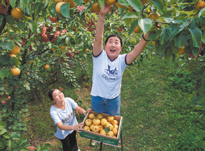 利用依傍黄河的区位生态优势,山东惠民县积极调整农业产业结构,实现种植业绿色转型。图为当地果农在采摘黄金梨。初宝瑞摄(人民视觉)