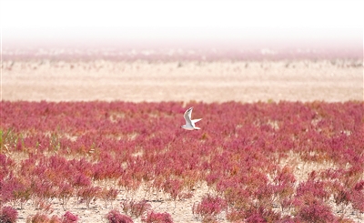 山东黄河三角洲国家级自然保护区开展退耕还湿、退养还滩,2017年以来修复湿地188平方公里。图为保护区滩涂上生长的碱蓬草。新华社记者 徐速绘摄