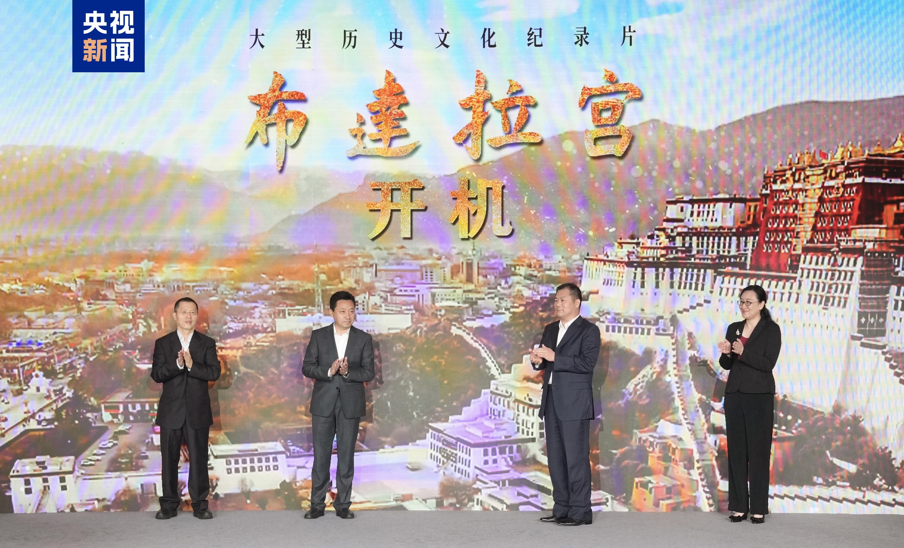 △郑堆、中宣部人权事务局一级巡视员朱宏立、中央广播电视总台总编室主任梁建增、总台英语环球节目中心副主任刘聪共同为《布达拉宫》开机