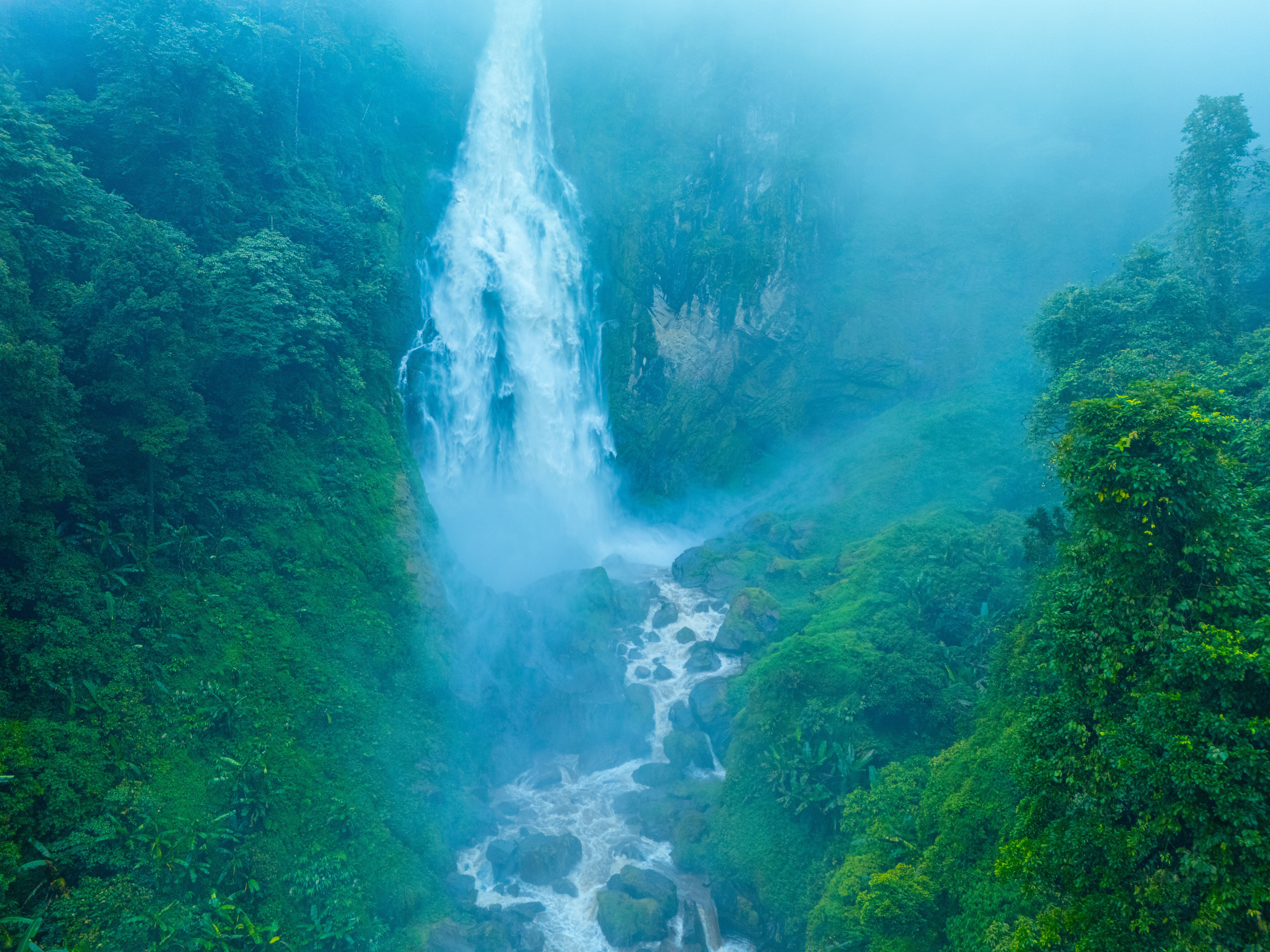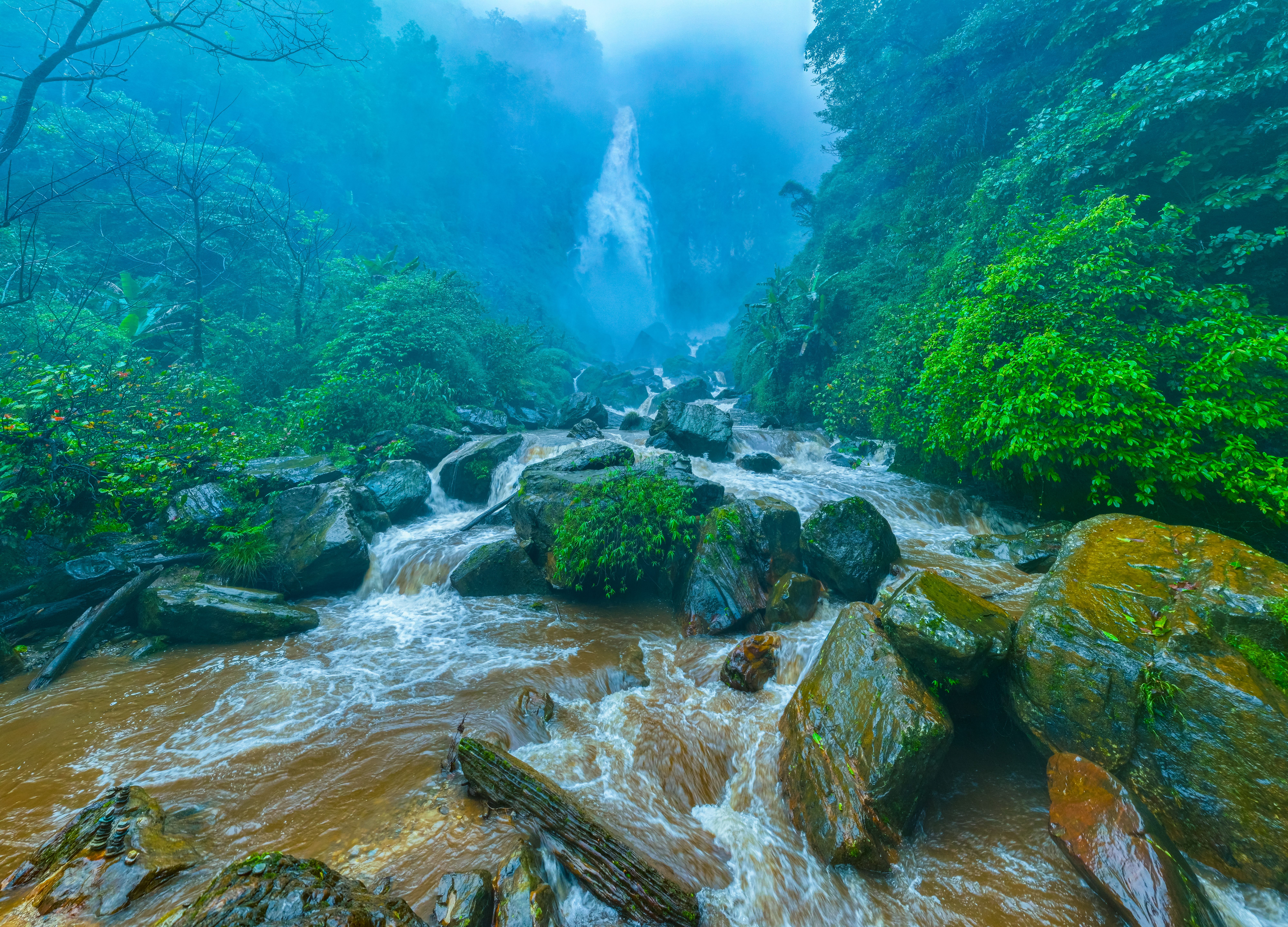 当天,摄影师们一行驱车前往哀牢山,经过数小时的徒步跋涉,终于抵达了隐藏在原始森林深处的燕子崖瀑布。只见瀑布从山顶飞流而下,水量充沛,势不可挡,如天河倾泻般砸入谷底,发出震耳欲聋的轰鸣声,回荡在山谷之间。