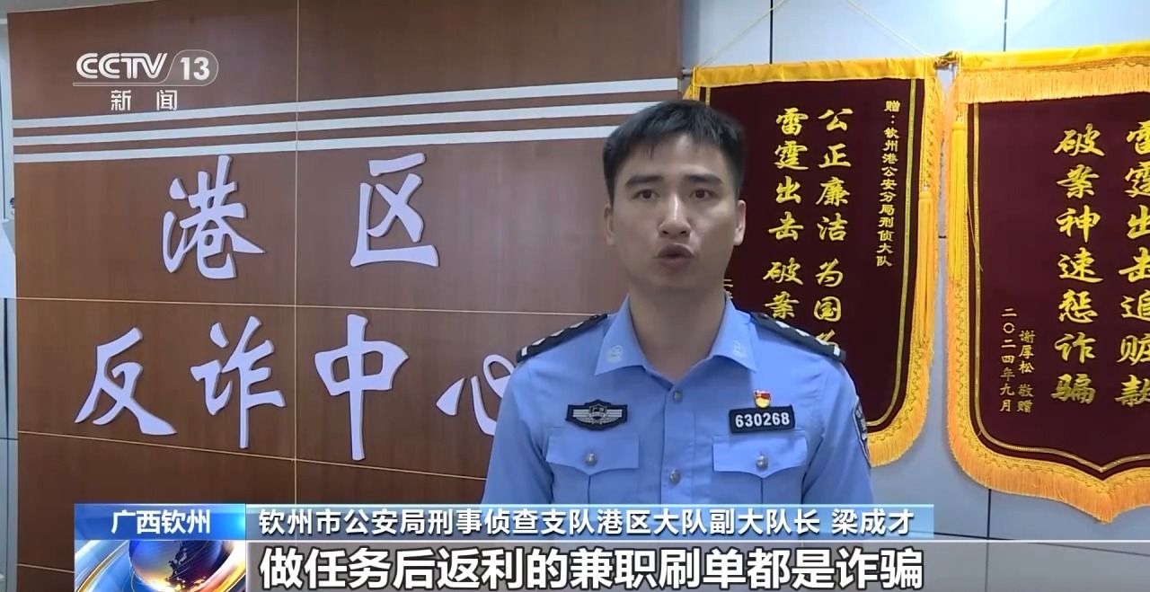 钦州市公安局刑事侦查支队港区大队副大队长 梁成才:刷单返利本身就是违法行为,所有要求垫资的,做任务后返利的兼职刷单都是诈骗,天上不会掉馅饼,没有不劳而获的美事。