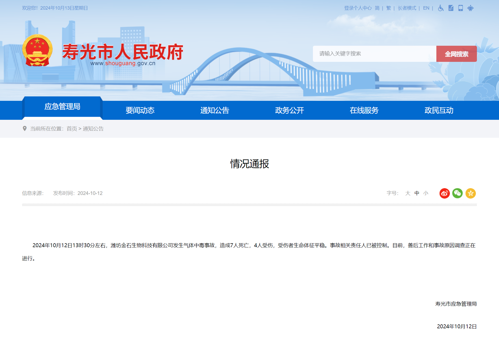 据寿光市应急管理局消息, 2024年10月12日13时30分左右,潍坊金石生物科技有限公司发生气体中毒事故,造成7人死亡,4人受伤,受伤者生命体征平稳。事故相关责任人已被控制。目前,善后工作和事故原因调查正在进行。
