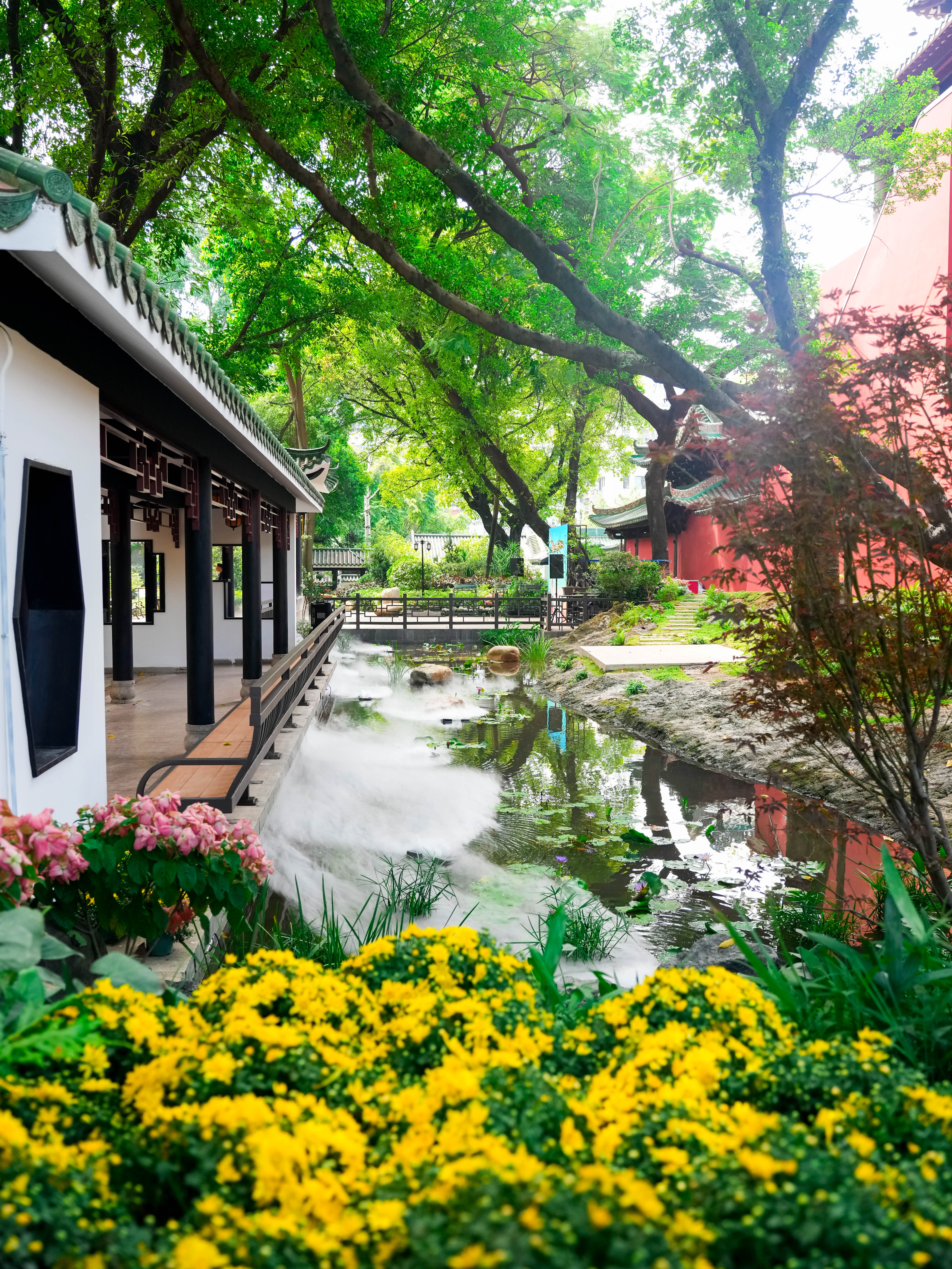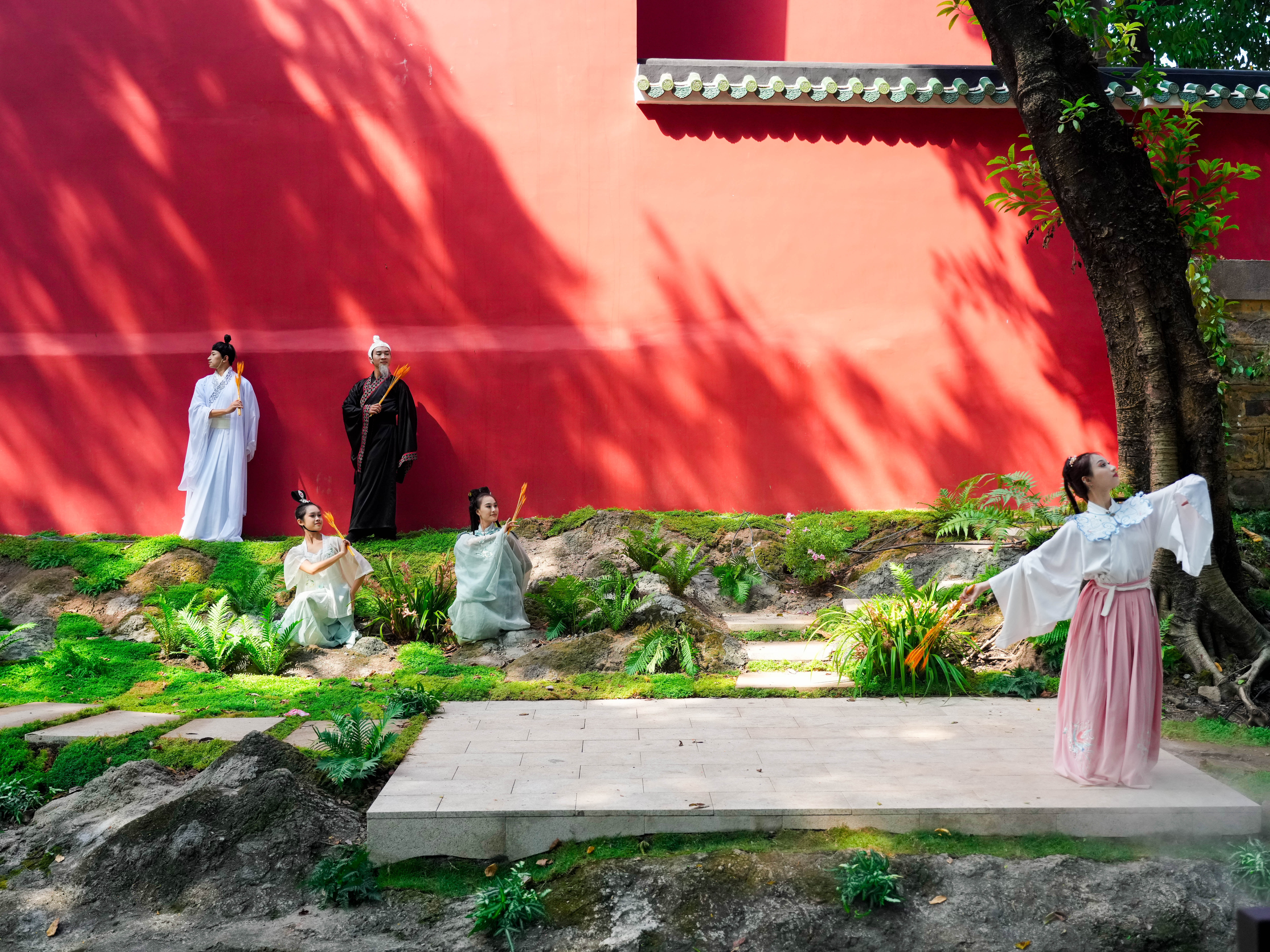 步至紫烟阁外,有一处叫“仙林苑”的园林,增种了三角梅、睡莲、菊花、凤凰木等植物,打造了“莲池舞台”等景观,引入古琴、箫笛、琵琶与五仙舞演出,自然与人文在这里相映相谐。