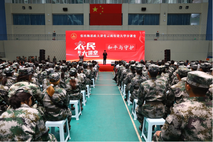 10月14日,张桂梅思政大讲堂云南农业大学分课堂——“农民院士大讲堂”第十一讲以“和平与守护”为主题开讲。 “一级战斗英雄”、中国人民解放军77283部队原副政委史光柱, 曾参加过抗日战争、解放战争的老战士盖全荣、董老伯走进军训场,为6000余名2024级新生带来一堂生动的思政课。
