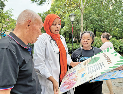 在社区义诊活动中,法缇娅·赛义德(左二)向居民介绍夏季高温应对常识。 |
