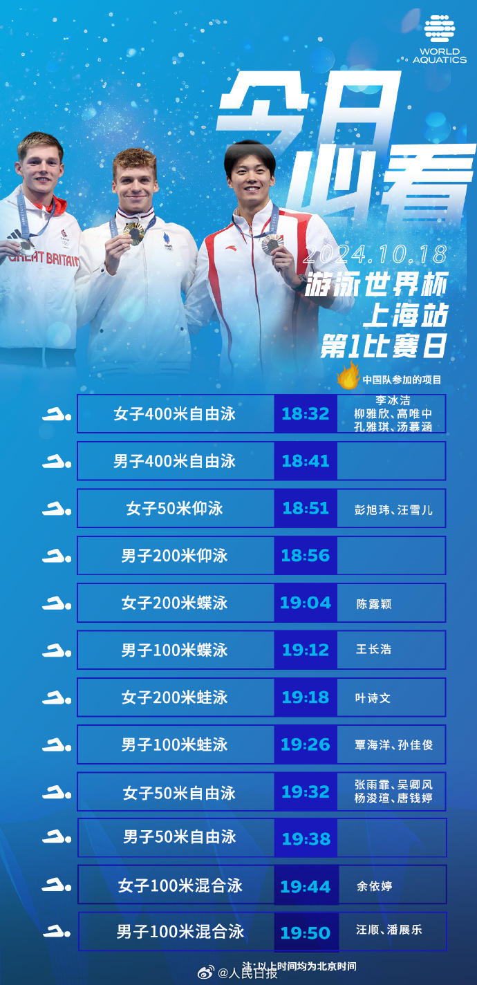 2024游泳世界杯上海站赛程今晚开启第1个比赛日!转发,为中国运动员加油!