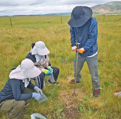 兰州大学张杭团队成员在钻取植物根系以获取根系样本。 |