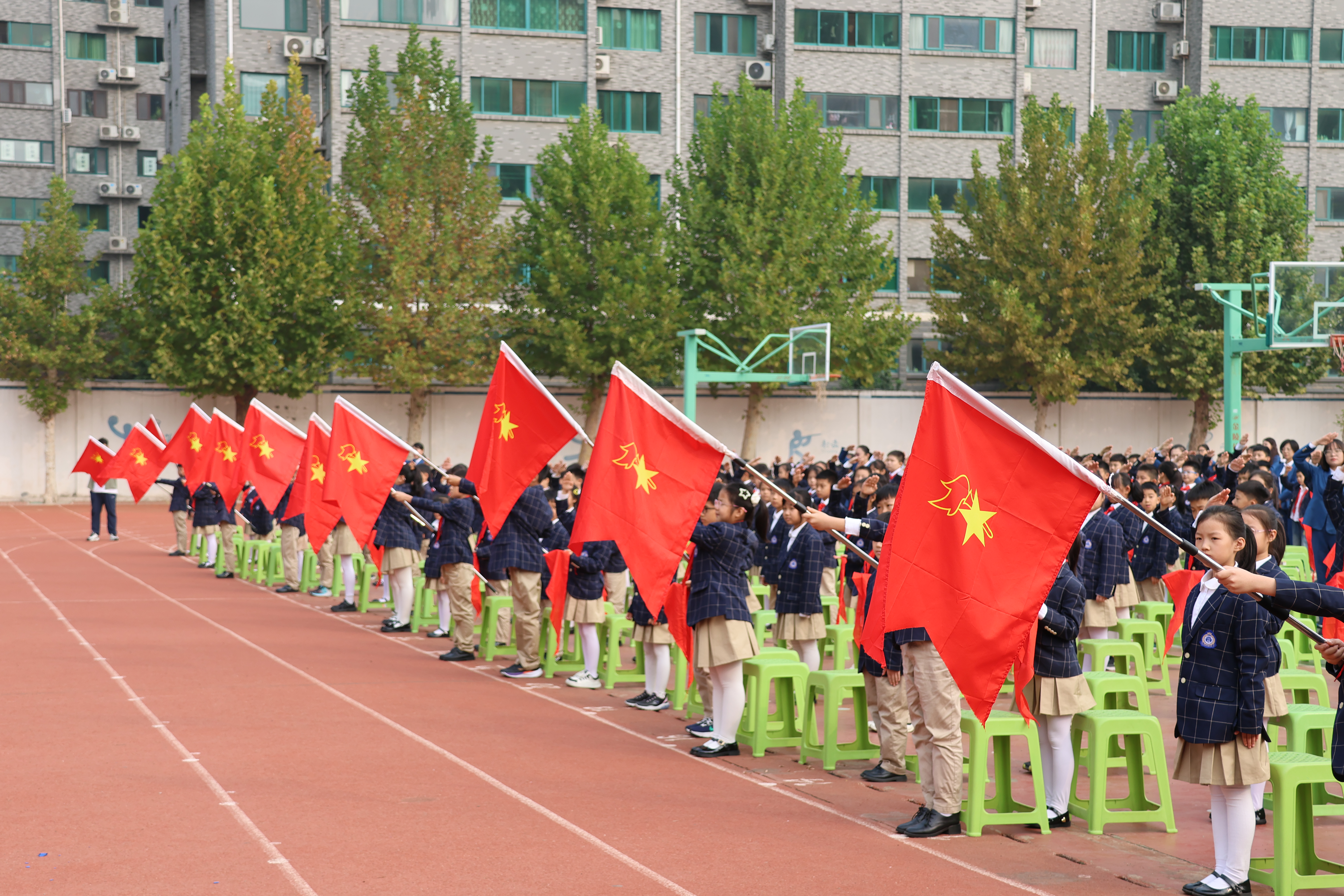 在激昂的出旗曲中,旗手们高举旗帜,步伐坚定,气宇轩昂。全体队员齐唱队歌,展现了少先队员的骄傲与自豪。