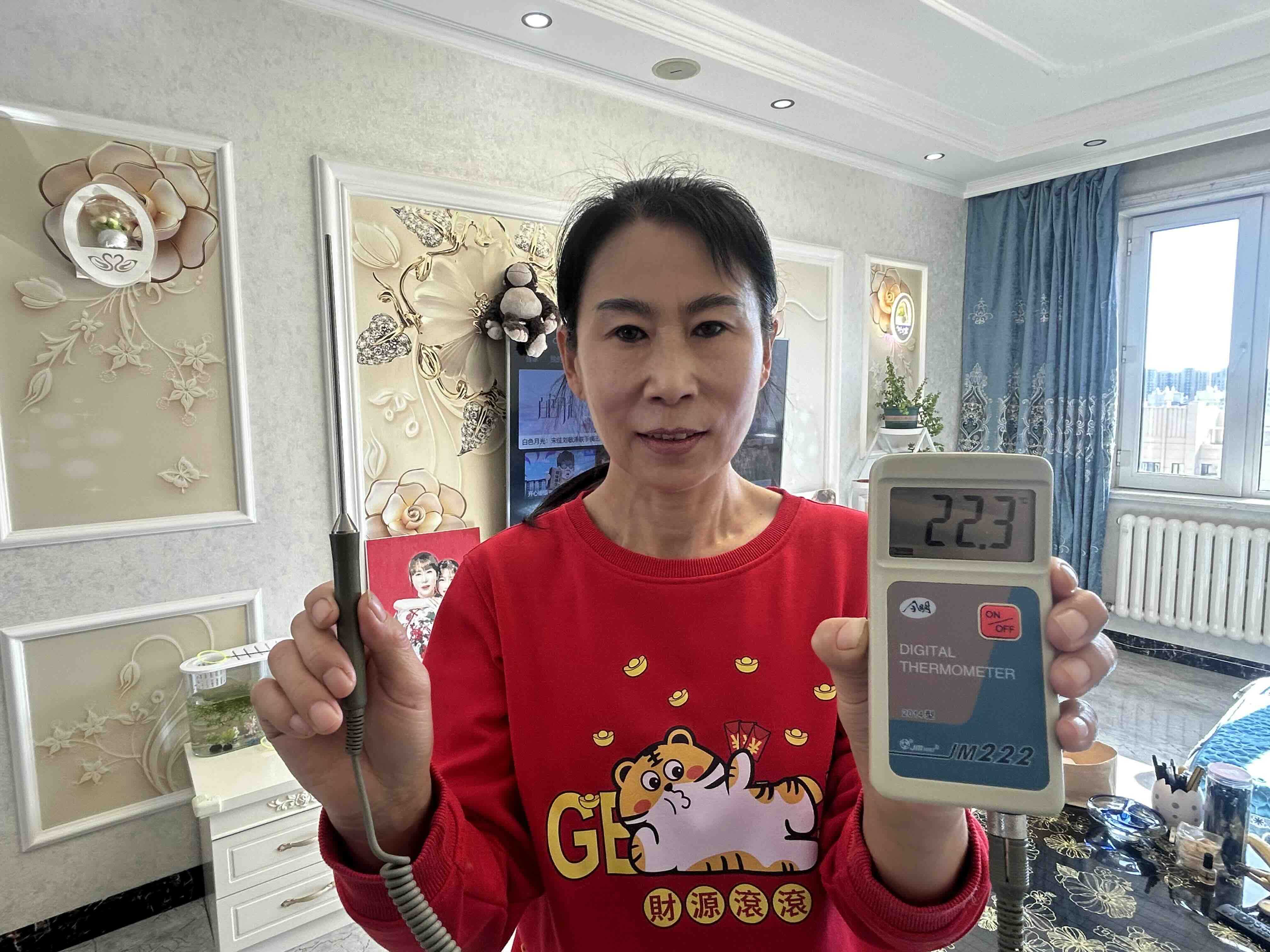 记者又随机来到道里区一曼街78号201室,经过测温,室内温度为22℃。居民李先生介绍,几天前室内就感觉到热乎气了,今年比往年提前热了几天,现在室内温度适宜。