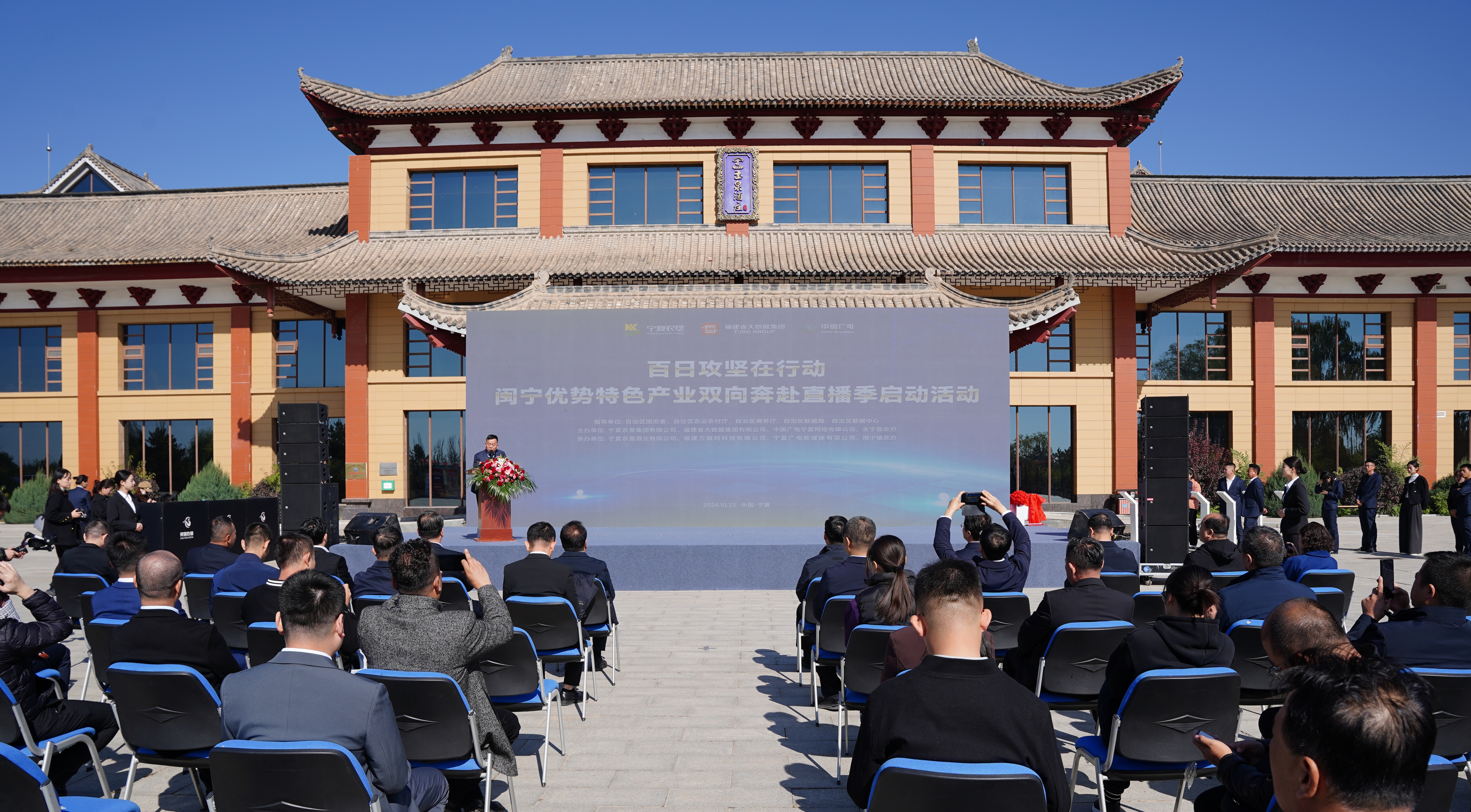 10月23日,由宁夏农垦集团有限公司、福建大数据集团有限公司、中国广电宁夏网络有限公司、永宁县人民政府共同举办的“百日攻坚在行动·闽宁优势特色产业双向奔赴直播季活动”在宁夏农垦玉泉国际酒庄正式启动,旨在深入开展农业领域“百日攻坚”行动,以“闽宁协作”作为纽带,整合优质农产品资源,拓宽销售渠道,持续深化闽宁两省区优势特色产业协作,有力有效解决经济运行面临的问题。