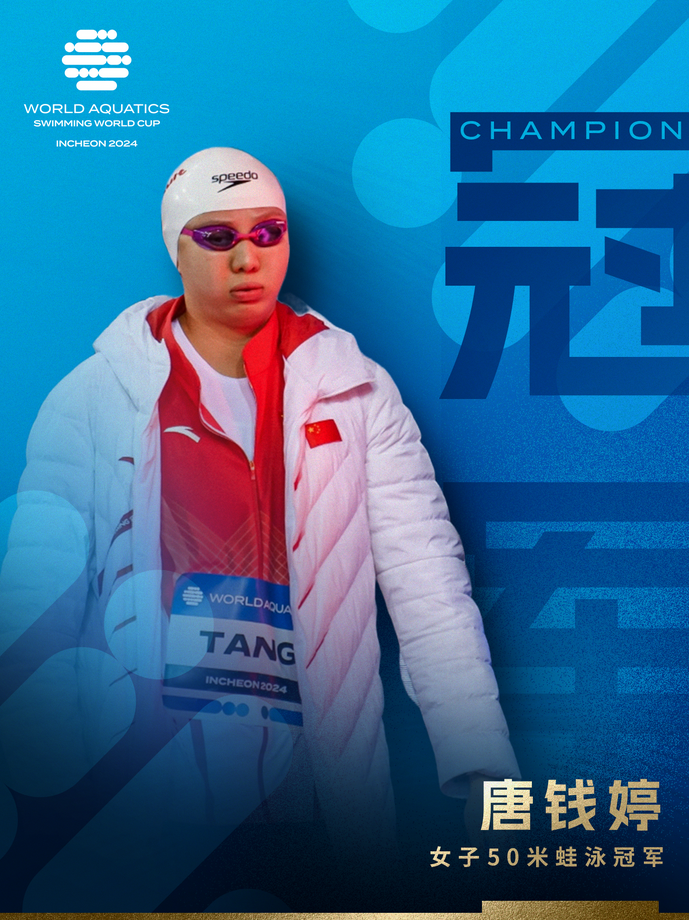 唐钱婷夺得2024游泳世界杯仁川站女子50米蛙泳冠军