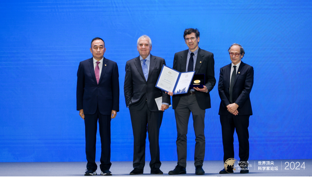 乔恩·克莱因伯格(右二)获颁“智能科学或数学奖”,迈克尔·I·乔丹(左二)宣读颁奖词。主办方供图