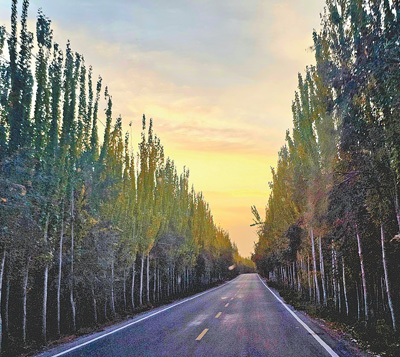 新疆喀什地区麦盖提县,一条宽阔的柏油路通往远方。道路两旁,沙枣、红柳、梭梭等连片的生态林长势茂盛。
