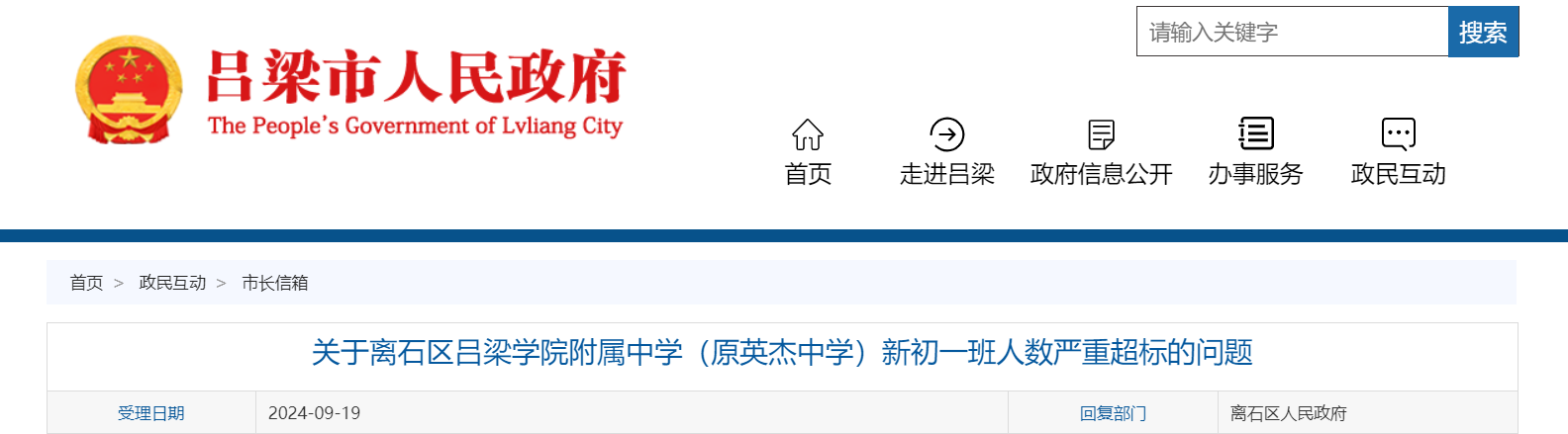 10月30日,记者从吕梁市人民政府官网获悉,离市区人民政府回复关于离石区吕梁学院附属中学(原英杰中学)新初一班人数严重超标的问题。