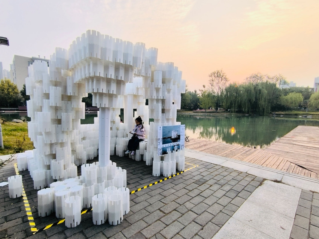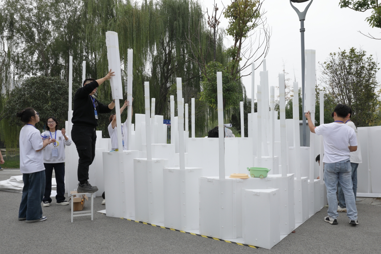本次比赛以粮食仓储建筑“筒·藏”为设计主题,以白色中空塑料板为材料,进行形式构思及空间搭建,为河南工业大学中心景观湖畔沿岸设计并搭建一组师生休息场所。在比赛过程中,各参赛队伍密切配合,以卓越的能力和高效的执行力,成功地完成了各项工作。