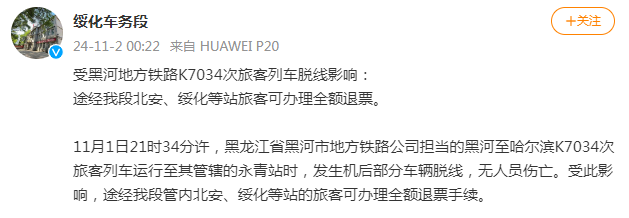11月1日21时34分许,黑龙江省黑河市地方铁路公司担当的黑河至哈尔滨K7034次旅客列车运行至其管辖的永青站时,发生机后部分车辆脱线,无人员伤亡。受此影响,途经我段管内北安、绥化等站的旅客可办理全额退票手续。