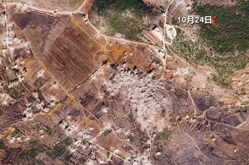 9月26日拍摄的卫星图像显示这些村庄遍布房屋和植被,而在10月24日拍摄的卫星图像中,这些村庄都已经成为废墟。