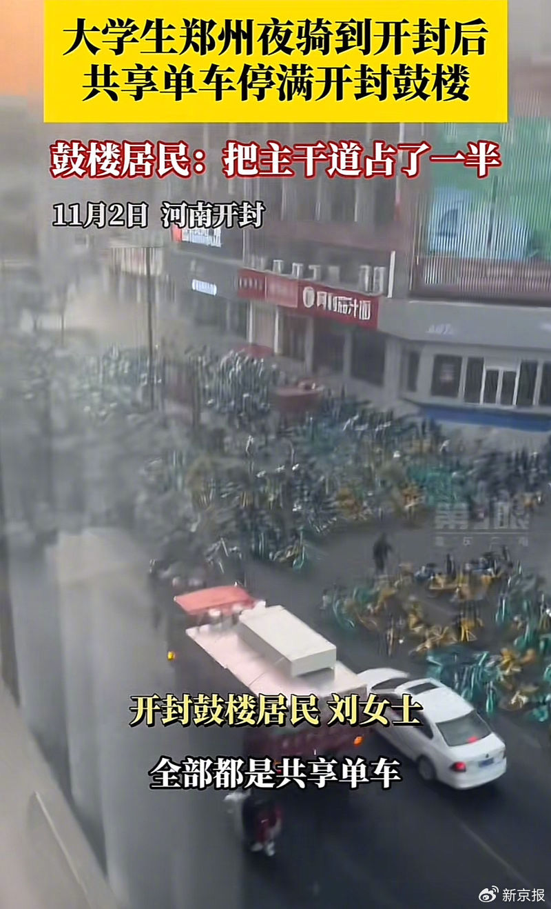 开封鼓楼附近居民发现,道路上停满了共享单车。图/社交平台视频截图