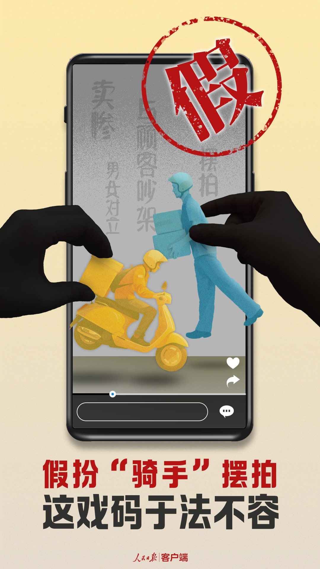 假冒“骑手”的戏码层出不穷,是对顶风冒雨的真骑手的伤害,也在愚弄公众,扰乱网络生态。各类虚假视频盯上的,远不止是外卖骑手。“病房百态”“婆媳矛盾”……哪里有故事可编、哪里有流量可挖,哪里就有造假者的影子。无视法律和道德底线,“带节奏”误导公众,消费大家的信任,结果最终只能是被用户和平台抛弃,接受法律的惩罚。