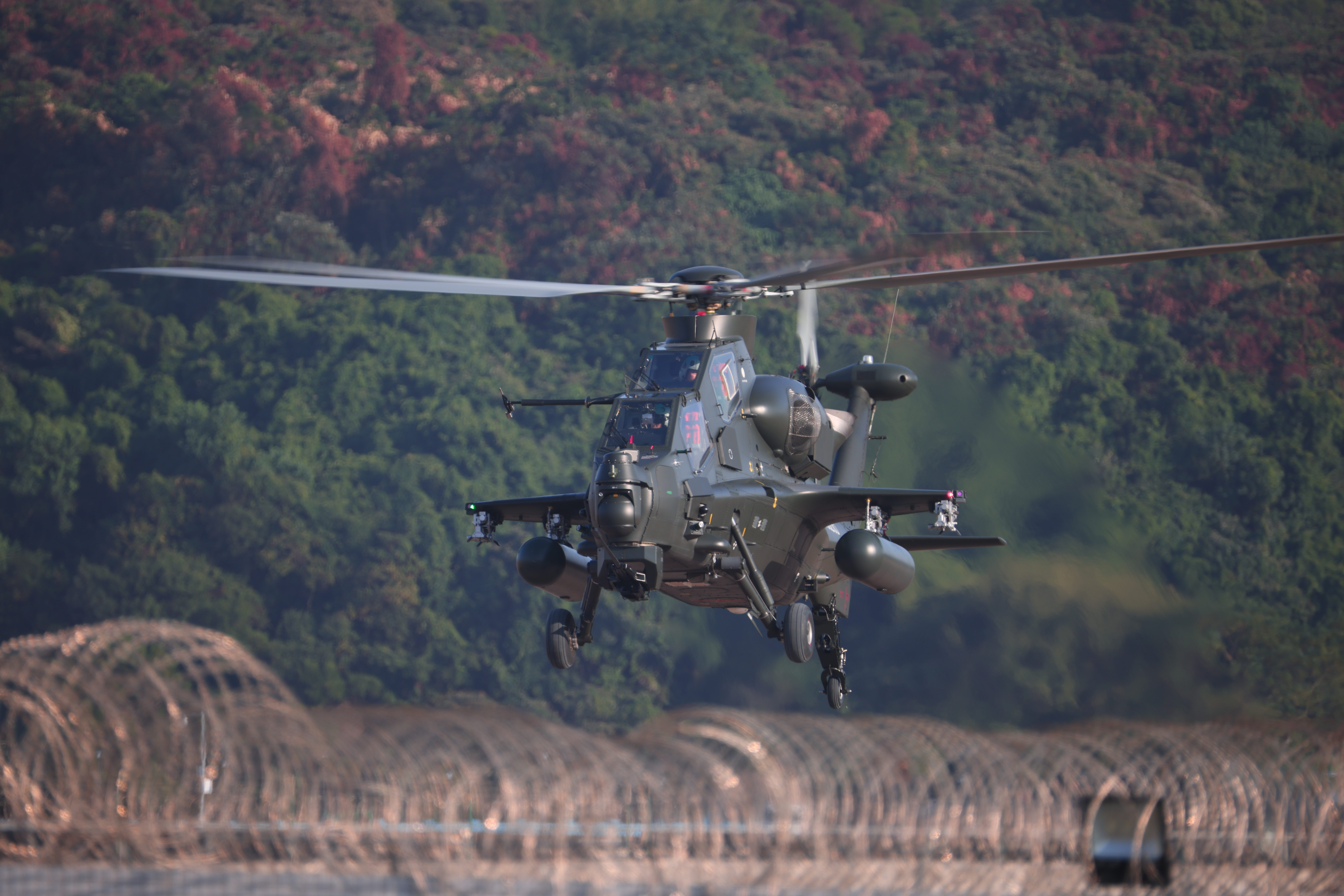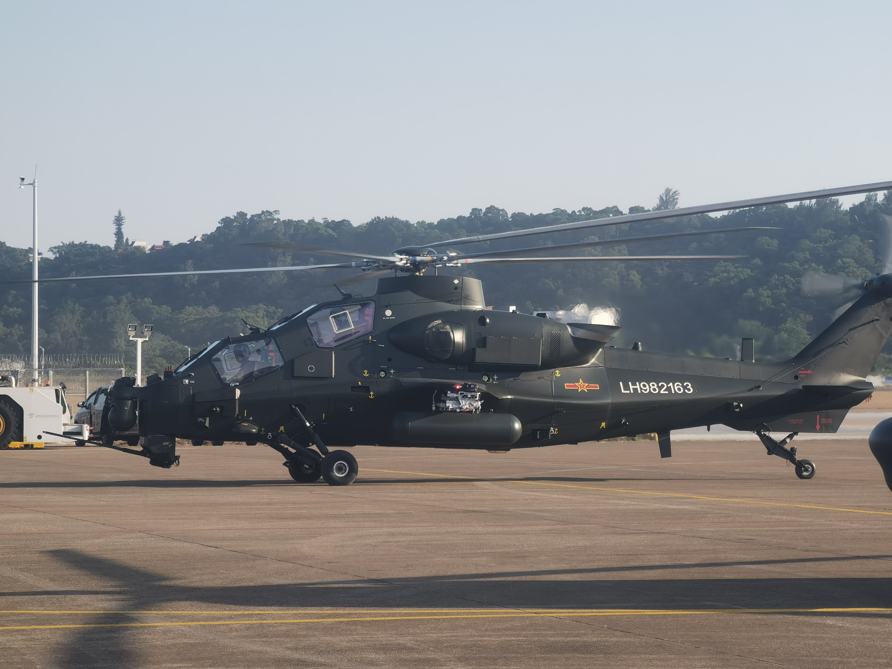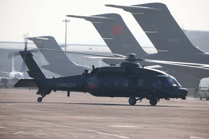 11日7日下午4点,陆军的直-20、直-10、直-8L、直-8G四个型号共计6架直升机平稳落地珠海国际航展中心机坪。