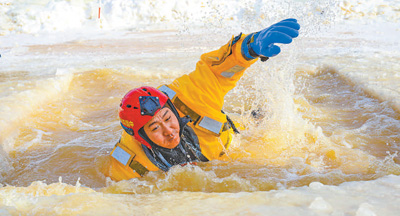 黑龙江黑河市森林消防支队消防员进行冰域落水自救技术训练。邱齐龙摄(人民视觉)