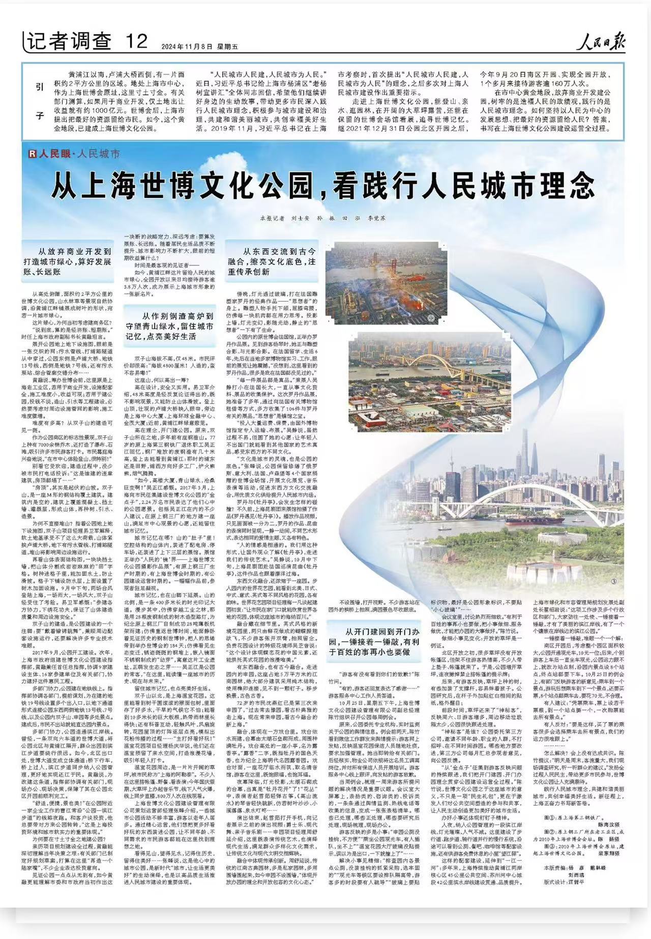 “从‘金点子’征集到游客反映问题的持续跟进,我们把开门建园、开门办园理念贯穿公园建设运营全过程。”陈竹说,世博文化公园之于这座城市的意义,不只是一项“民生礼包”,更在于激发人们对公共空间塑造的参与和共享,让人民主动创造更加美好的城市生活。