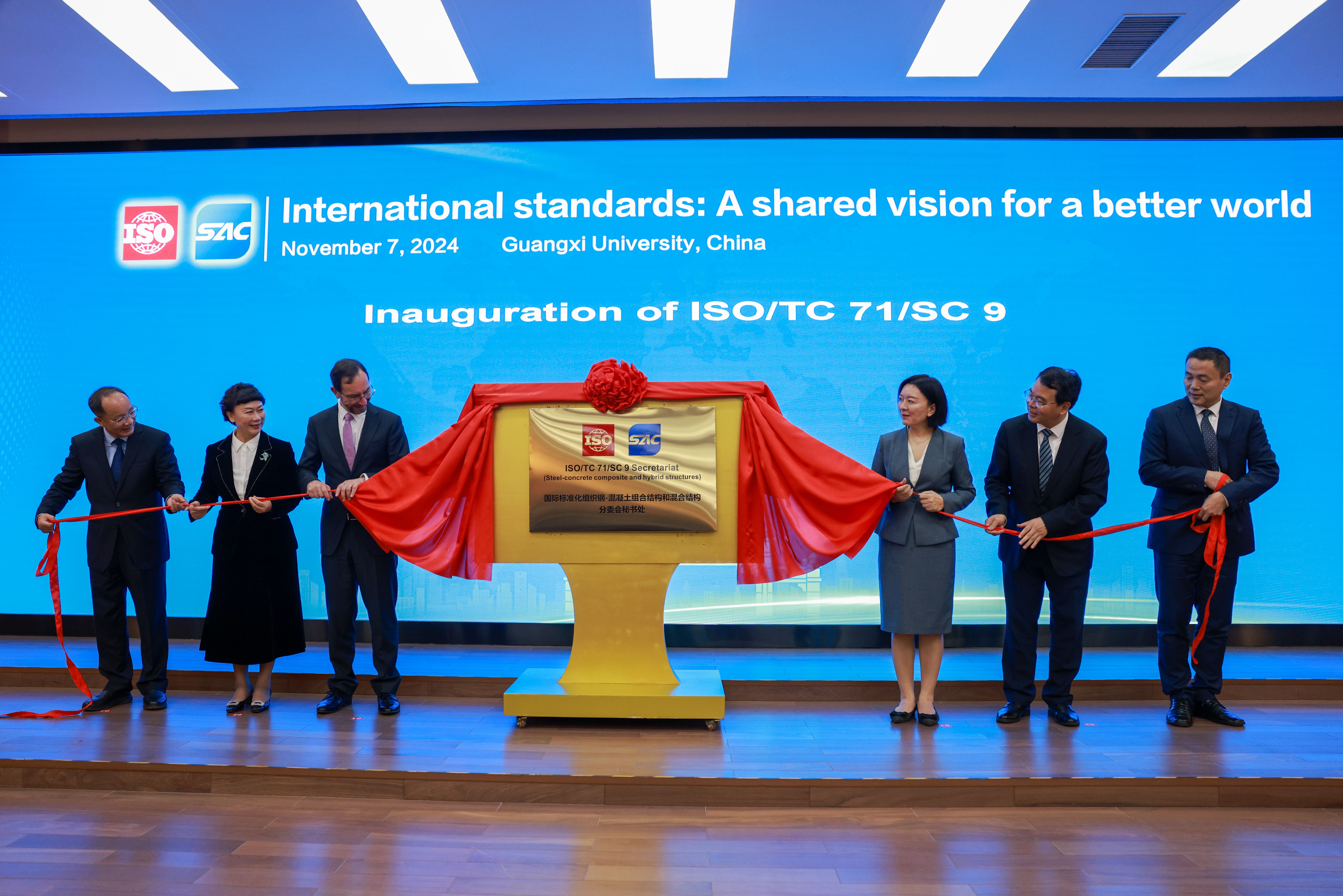 11月7日,由广西壮族自治区市场监管局和广西大学联合主办的“美好世界的共同愿景”国际标准化主题活动在广西大学举办,并举行钢-混凝土组合结构和混合结构分委会(ISO/TC 71/SC 9)秘书处揭牌仪式。