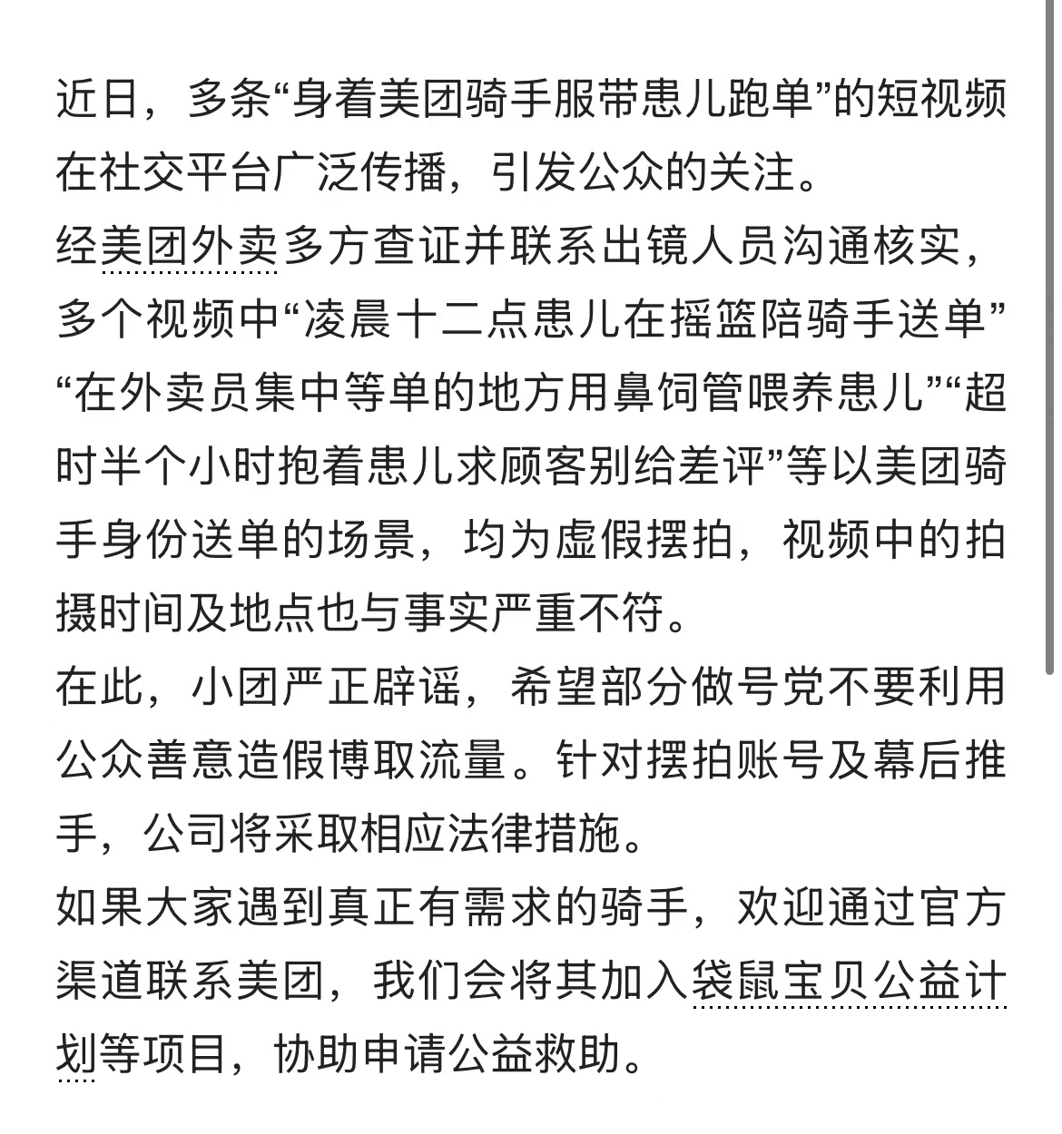 在相关视频引发关注后,美团外卖对外发布辟谣声明:经多方查证并联系出镜人员沟通核实,多个视频中“凌晨十二点患儿在摇篮陪骑手送单”“在外卖员集中等单的地方用鼻饲管喂养患儿”“超时半个小时抱着患儿求顾客别给差评”等以美团骑手身份送单的场景,均为虚假摆拍,视频中的拍摄时间及地点也与事实严重不符。