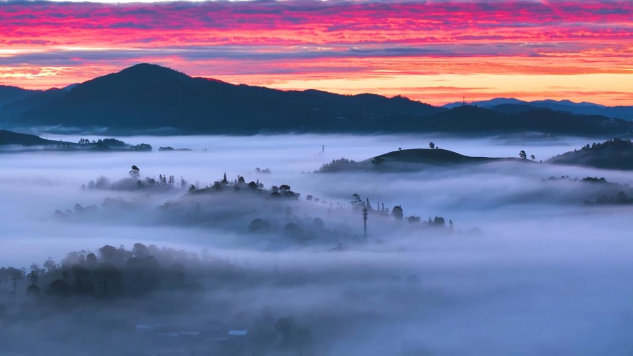 远处,火红的朝霞如同一幅绚丽的画卷徐徐展开,那热烈的色彩与山间的清冷雾气形成了强烈的冷暖对比,给人以强烈的视觉冲击,如诗如画。