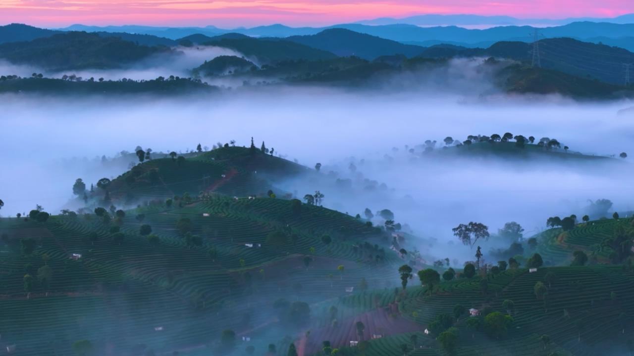 从高空俯瞰,山间雾气袅袅升腾,如轻纱般缭绕,将整个茶山笼罩其中,宛如仙境一般。
