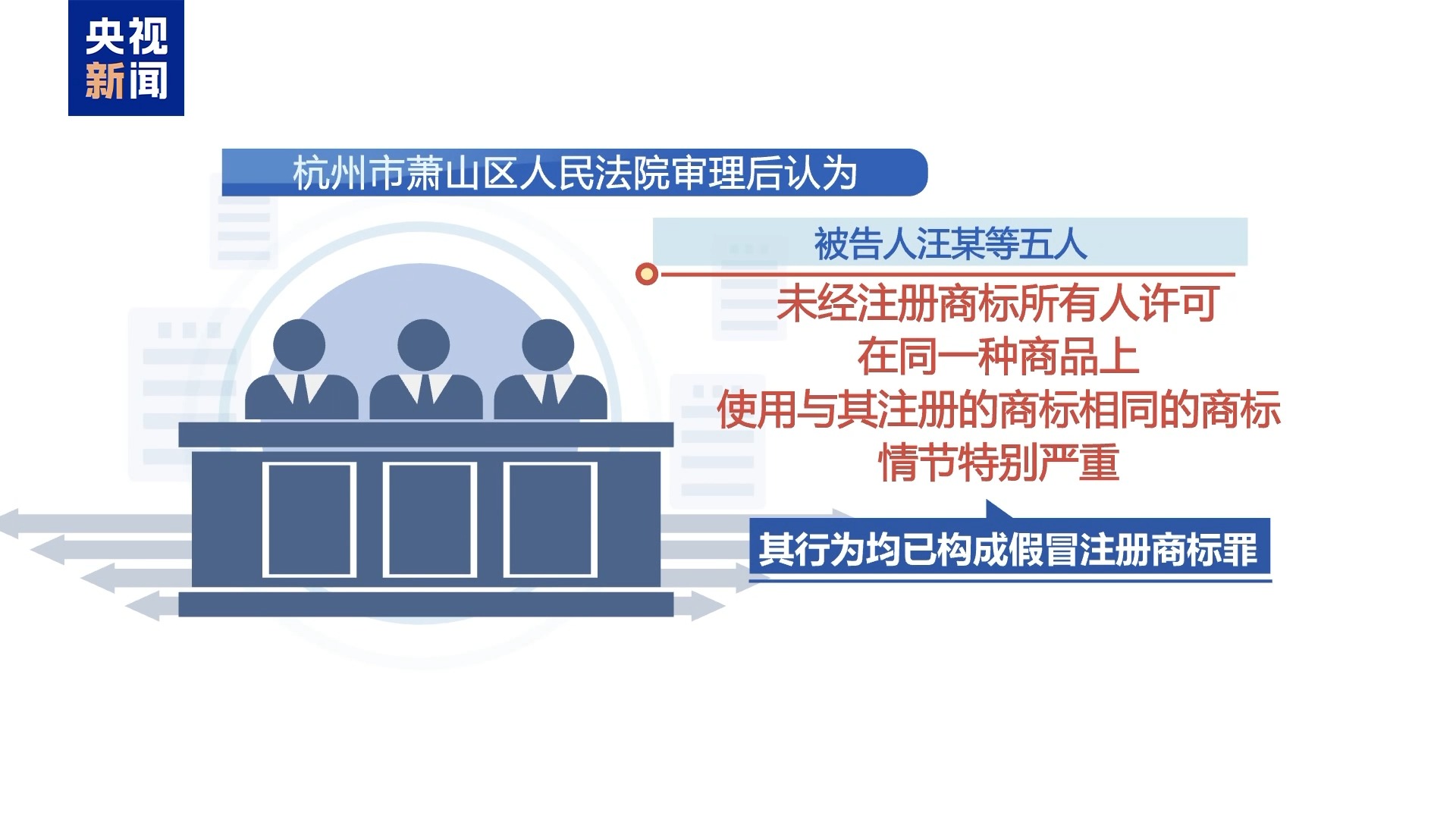 杭州市萧山区人民法院审理后认为,被告人汪某等五人,未经注册商标所有人许可,在同一种商品上使用与其注册的商标相同的商标,情节特别严重,其行为均已构成假冒注册商标罪,对主播汪某及其丈夫管某均判处有期徒刑三年,缓刑三年九个月,并对两人均处以8万元罚金;其他3名被告人也被判处三年有期徒刑,缓刑三年三个月到三年六个月不等,并被处以3万至6万不等的罚金。