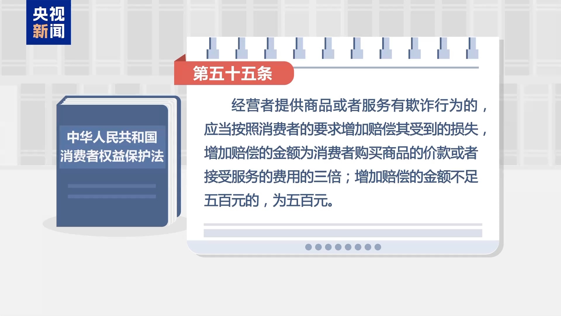 我国消费者权益保护法第五十五条规定,经营者提供商品或者服务有欺诈行为的,应当按照消费者的要求增加赔偿其受到的损失,增加赔偿的金额为消费者购买商品的价款或者接受服务的费用的三倍;增加赔偿的金额不足五百元的,为五百元。