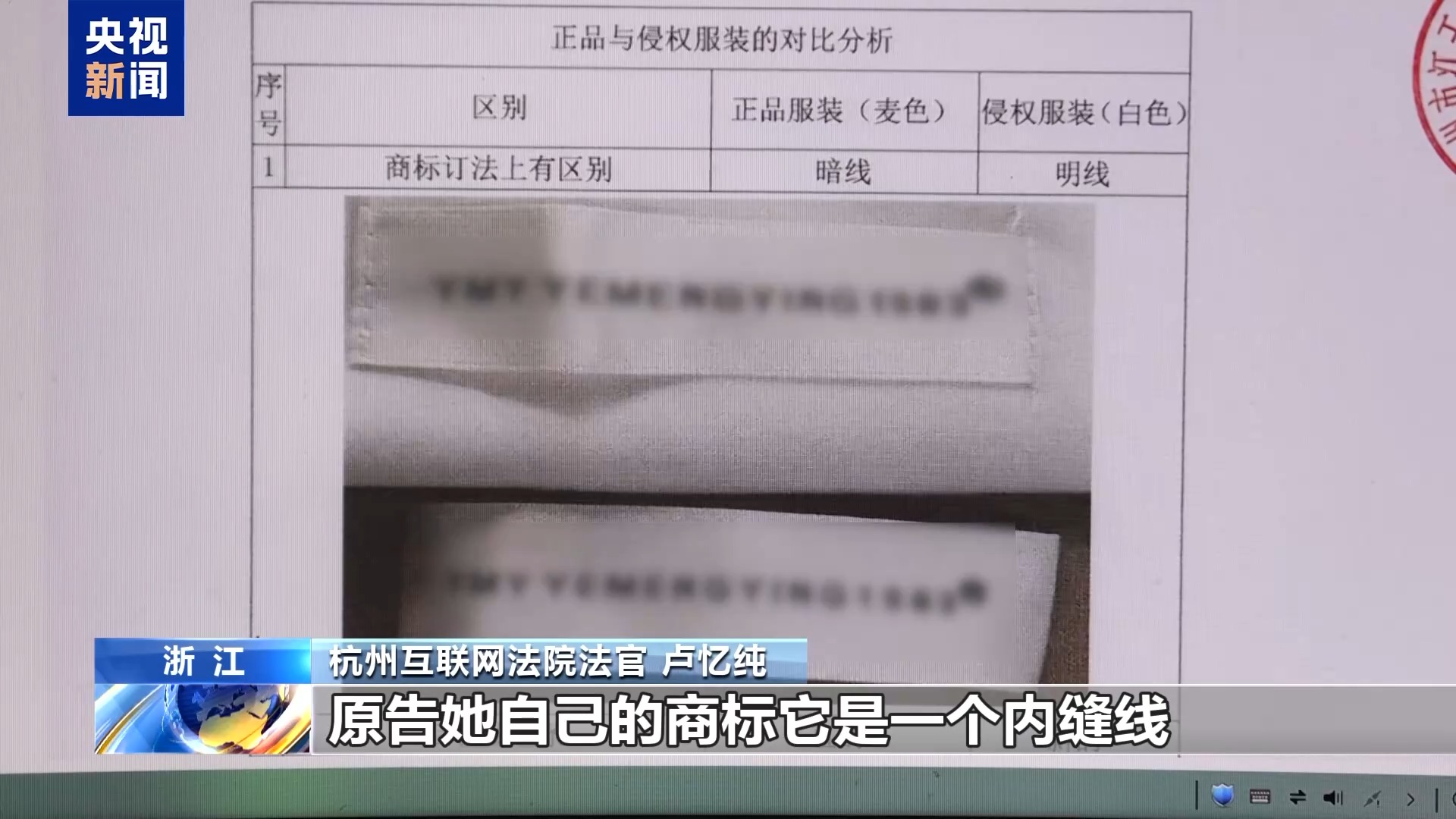 杭州互联网法院法官 卢忆纯:退货的时候,原告发现有一些服装品牌跟他们自己生产的服装品牌在缝线,商标的纹路上有所差别。原告自己的商标是内缝线,但是被告的商品是外缝线。他们走线的路径也不一样,原告是直纹走线,被告是斜纹走线。