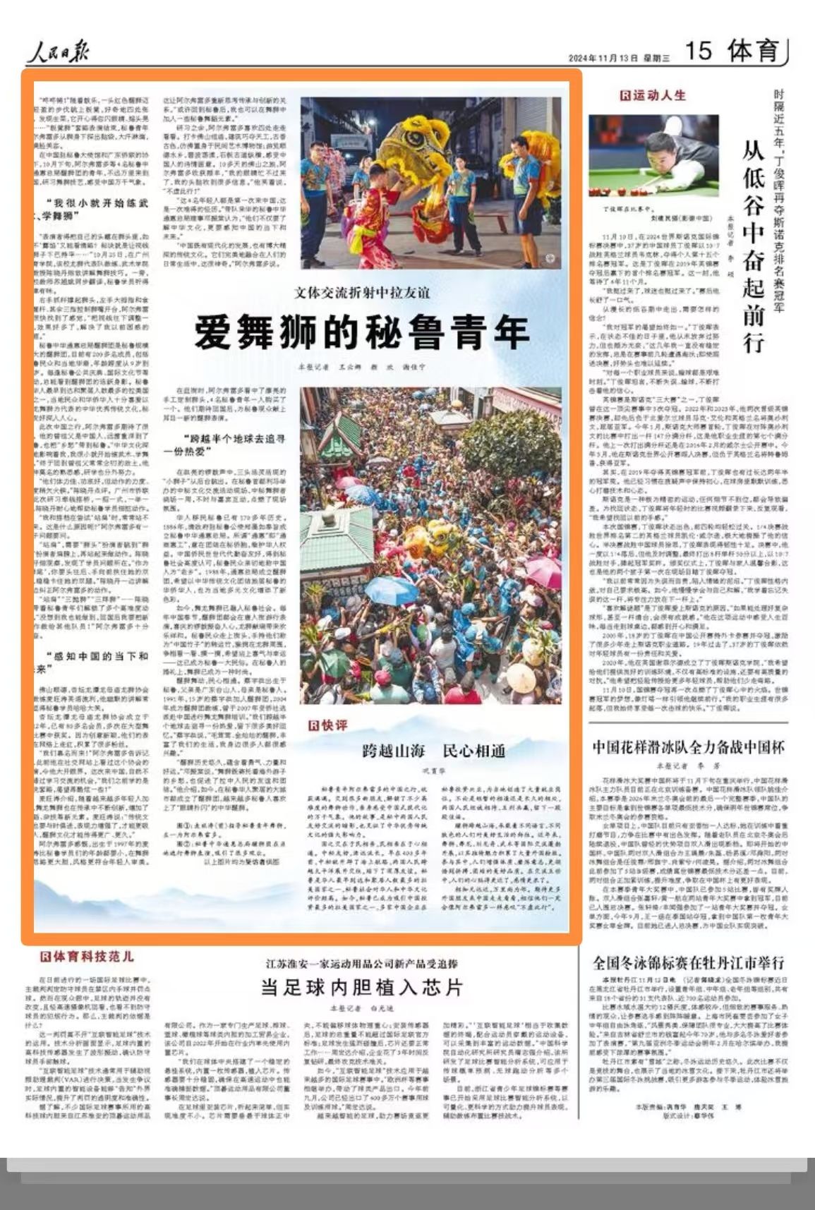 醒狮舞动,民心相通。蔡宇洪出生于秘鲁,父亲是广东台山人,母亲是秘鲁人。1991年,15岁的蔡宇洪加入醒狮团,2004年成为醒狮团教练,曾于2007年受侨社选派赴中国进行舞龙舞狮培训。“我们跨越半个地球去追寻一份热爱,留下很多美好回忆。”蔡宇洪说,“毛茸茸、金灿灿的醒狮,丰富了我们的生活,我身边很多人都很感兴趣。”